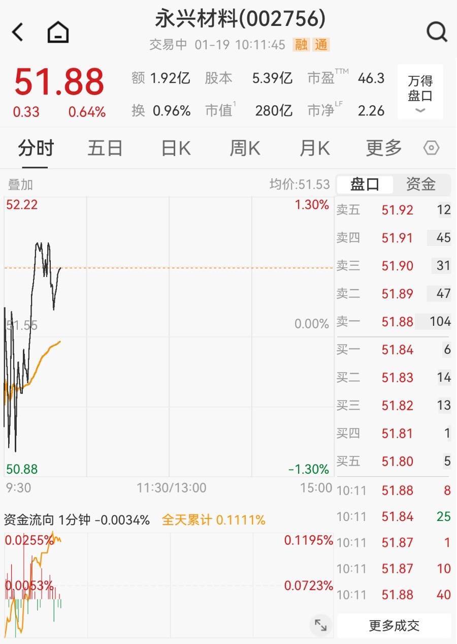 截至1月19日10:11,永兴材料报51.88元/股,涨0.64%,总市值为280亿元。